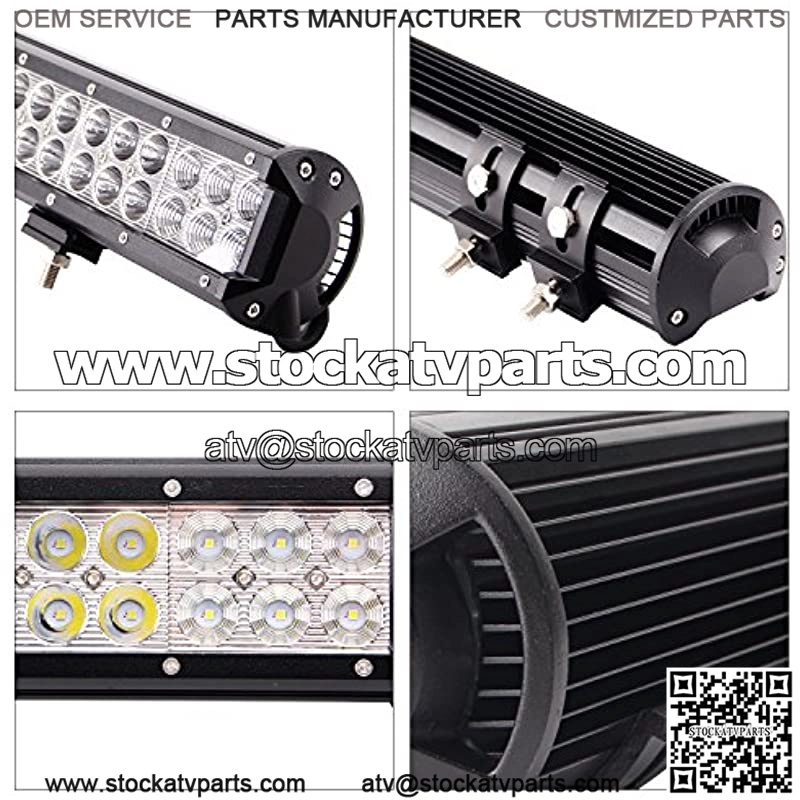126W Combo Light Bar with 2 Spot Light with 2 Rows 54LEDs CREE Chips, can emit super bright light, lights up a central point, offering you a wider illumination range at night, allowing you to see the front road as clear as day which can install easily and long lifespan High Perfomance: IP67 Waterproof Rate, waterproof up to 1 meter of water for 30 minutes and effectively dustproof. With durable die-cast aluminum housing, toughed glass and stainless steel mounting bracket, the light bar can withstand harsh condition. Better Heat Disation: Light bar backside aluminum sinks enlarged the heat disation area, cooling the light quickly, protecting the light bar from overheating while working. Diecast aluminum housing Is heat resistant and also durable enough to extend light bar’s lifespan to over 50000 hours. Wide Usage: The light bar can be compatible with almost all 4×4, Cars, Trucks, Motorcycles, SUVs, ATVs, Boats, etc. Many indoor and outdoor uses: Garden Lighting, Backy