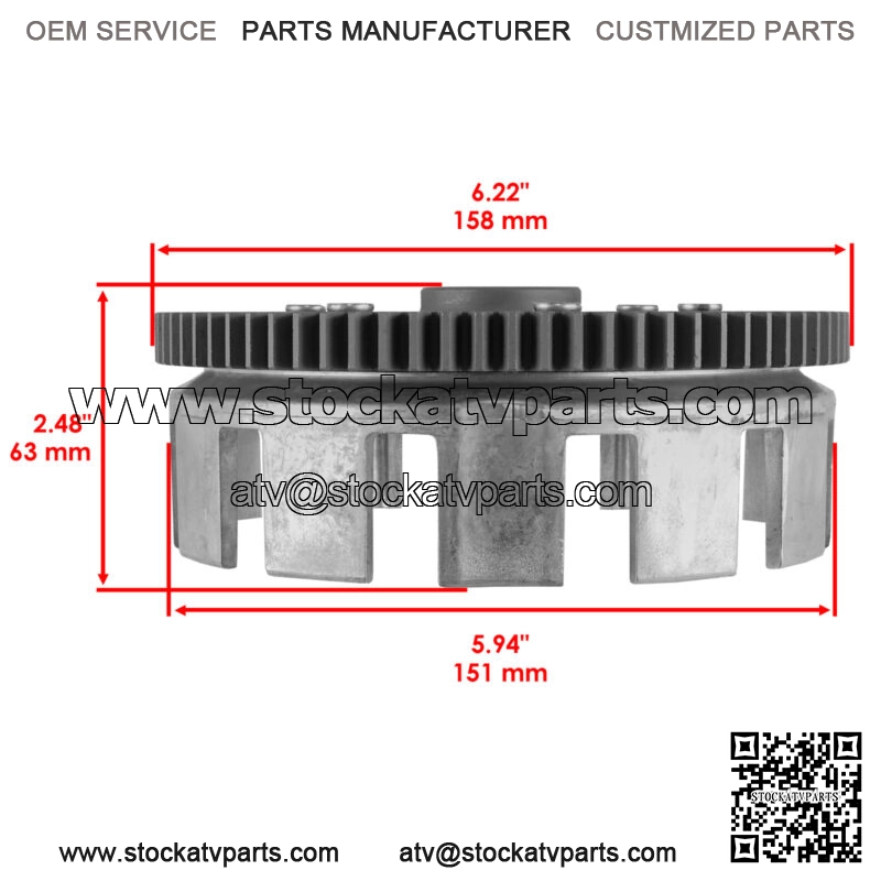 Gear Outer Diameter : 158mm | 6.22″Basket Inner Diameter : 25mm | 0.98″Basket WIdth : 63mm | 2.48″Basket Inner Diameter : 141mm | 5.55″Basket Outer Diameter : 151mm | 5.94″Clutch Friction Plate Thickness : 3mmClutch Steel Plate Thickness : 1.9mm
