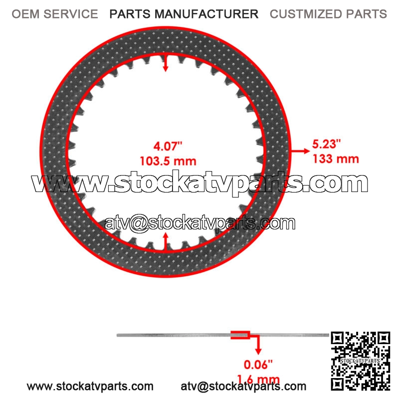 Dimensions & MeasurementsClutch Friction Plate Thickness: 3mm | 0.11″Clutch Friction Plate Inner Diameter: 111mm | 4.37″Clutch Friction Plate Outer Diameter: 144mm | 5.67″Clutch Steel Plate Thickness: 1.6mm | 0.06″Clutch Steel Plate Inner Diameter: 103mm | 4.07″Clutch Steel Plate Outer Diameter: 133mm | 5.23″Clutch spring Length: 33.5mm | 1.31Clutch spring Width: 19.5mm | 076″Clutch spring Thickness: 2.3mm | 0.09″