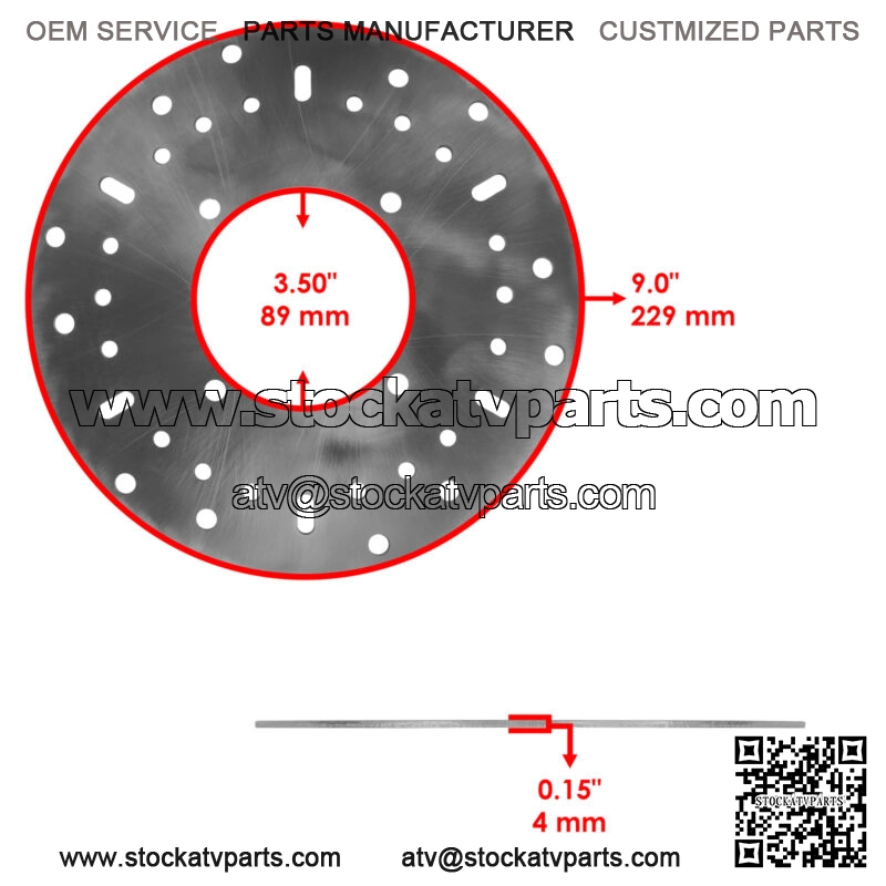 Front Disc Inner Diameter 3.50″ | 89mmFront Outer Diameter 9.0″ | 229mmFront Disc Thickness 0.15″ | 4mmRear Outer Diameter 8.0″ | 203mmRear Disc Thickness 0.18″ | 4.75mmRear Disc Mounting Hole Distance 3.7″ | 94mm Order Includes: