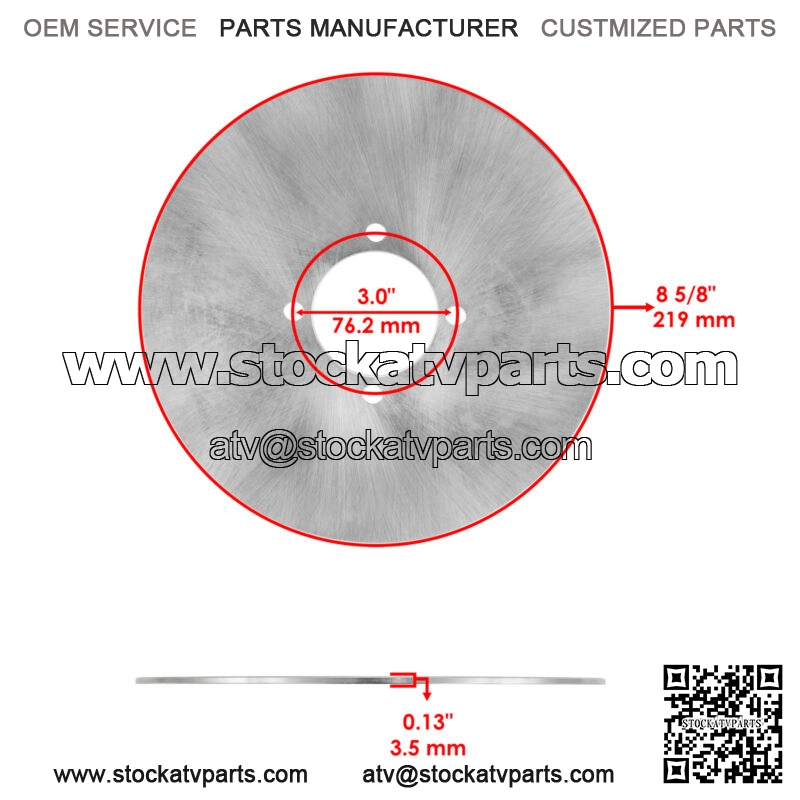 Front Disc Mounting Hole Distance 4 1/8″ | 104.7mmFront Outer Diameter 7 15/16″ | 201.6mmRear Disc Inner Diameter 3.0″ | 76.2mmRear Outer Diameter 8 5/8″ | 219mmFront Disc Thickness 0.15″ | 3.9mmRear Disc Thickness 0.13″ | 3.5mmFront Brake Pad Thickness 7mmRear Brake Pad Thickness 9.5mm Order Includes: