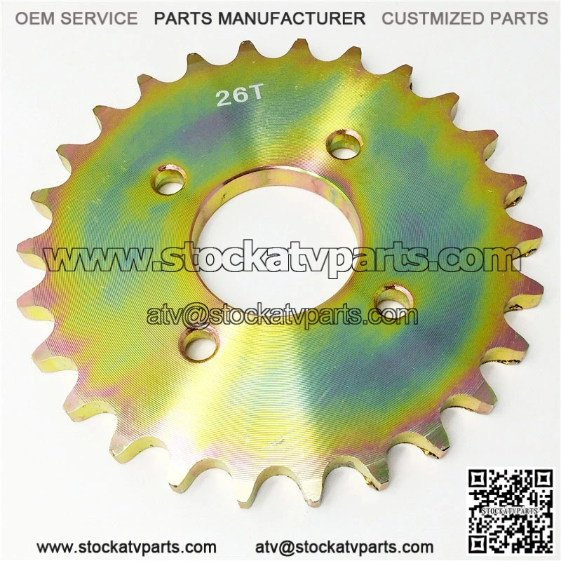 This driven sprocket has 26 teeth and fits a 16mm pitch chain, with a chain width of 20mm. Standard fitment on the Kazuma 110 and 150cc Falcon. It fits a quad bikes rear wheel using four screws.