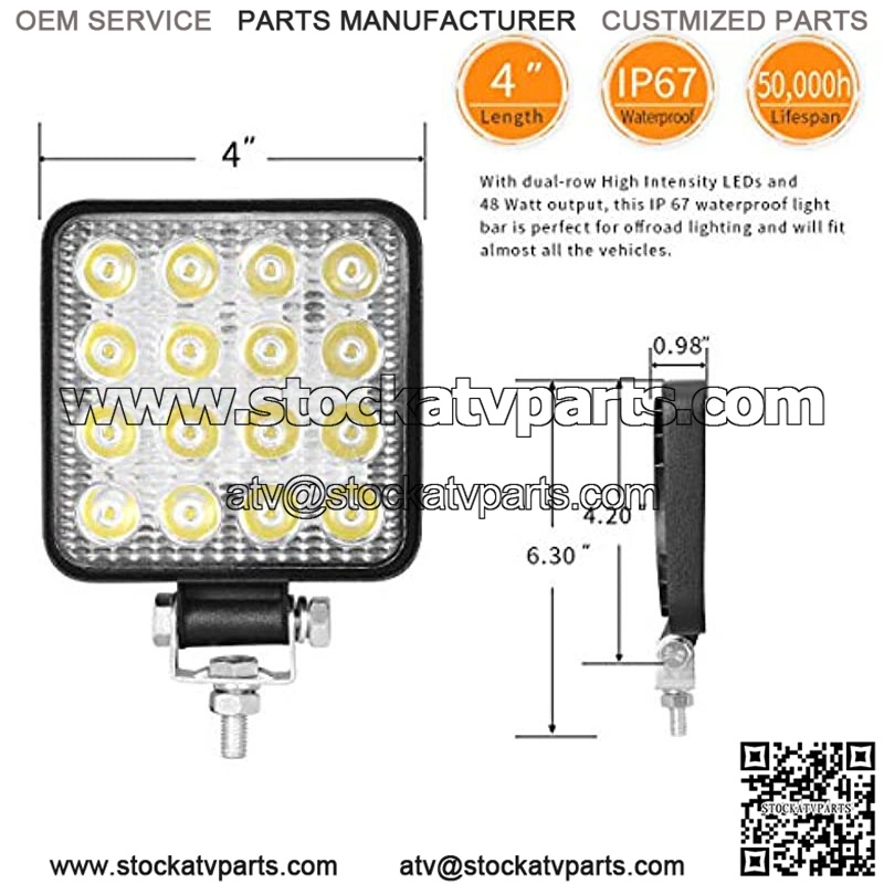 Super Bright: 4inch square Led Light bar with 16pcsx3w High intensity led, total of 48W at 6,000K color temperature. It can light up the entire forward viewing area, that will give you comfortable and safe driving.