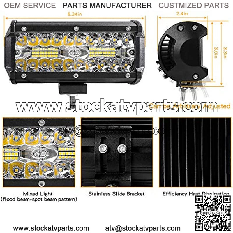 Triple Row Spot&Flood Combo BeamThis led light bar adopts advanced led chips,which provide bright and white ray for clear visibility,the 15 spot & 170 flood optic system provides wider/further illumination range,you can enjoy a safe driving experience with the led offroad light bar.Efficient Heat Disation The 7in led light bar has heavy duty 6063 aluminum alloy housing,10 cooling fins to maximize surface area for optimum cooling and extend the led driving light bar service life to 50,000 hours.High-quality Waterproof PerformanceThis waterproof light bar is IP67 waterproof certified,which means it is waterproof,dust-proof and shock resistant.The all-aluminum housing can resist harsh environments and protects off road lights from rain,wind and sand during off-road travel.Free 10ft Wiring Harness-2 LeadThe led light bar wiring harness with relay and high current injection molded fuse,which has a good conductivity,the high temperature resistant led wiring harness is suitable f