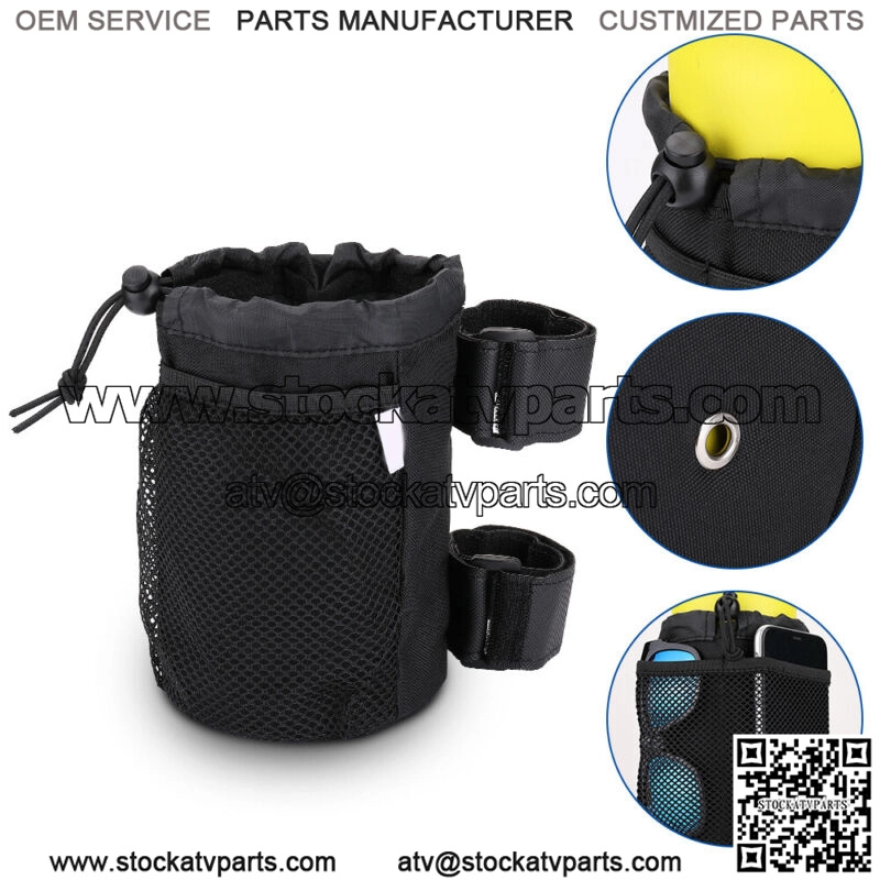 Specifications:Condition: Aftermarket Brand New, 100% DESIGNED~Color: BlackMaterial: Upgraded 600D Waterproof FabricAttachment Method: Strap lockSuitable for the size of Handlebar: 1 – 2 1/2 inches;Features:;- WIDE APPLICATION: This universal cup holder can be attached on anything with a 1 to 2 1/2 diameter roll bar.;- MULTI-FUNCTION DESIGN:; Two mesh pockets help you to store cellphones, keys, sunglasses, small cards and etc to make your item organized.;- Heat Preservation: Inner 4MM PE foam keeps the drinks cool in summer and warm in winter.;- Double Stablized Design:; Comes with two extra hook and loop tapes, which can keep the cup holder more stable in place.;- Drawstring Design:; Fits most of cups and bottles, even 32oz high capacity bottle and keeps your cup stable, secure your items inside and won’t fall off.;;- Collapsible;; Washable Material: Cup holder is collapsible without breaking or cracking, easy to clean, washable and wont be out of shape.- Drain Hole: There is a drain hole at the bottom of cup holder to drain the water out and keep your holder dry and clean. You don’t have to worry about getting wet or piling up water all the time.;Fitment:1. Great cup holder can be compatible with ATV, UTV, Wheelchair, Boat, Treadmill,Rollators, Rolling Walkers,Scooters, Knee Walkers.2. Compatible with Outdoor swing, Dodges roll bar, Kawasaki Mule, Polaris Ranger Crew, Yamaha Rhino, Binocular, Teryx 43. Compatible with; Polaris Polaris Ranger Can Am Commander and Maverick, etc..;Package includes:1 x cup holder + 2 x hook and loop tapes;
